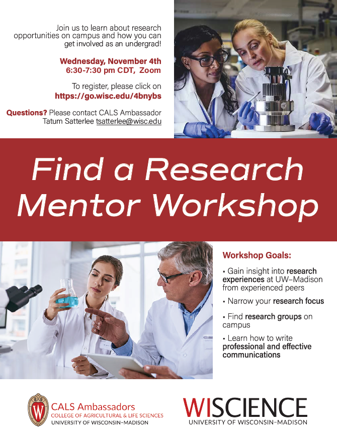 Interested in engaging in research on campus and not sure where to start? CALS Ambassadors are partnering with the Wisconsin Institute for Science Education and Community Engagement (WISCIENCE) to offer a Find a Research Mentor Workshop.